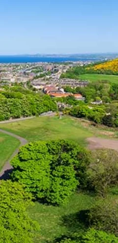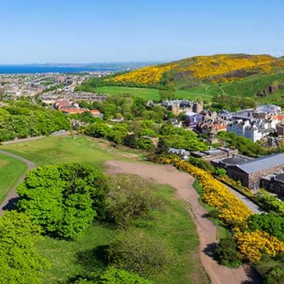 Scenic hilltop trail and panoramic city views in dog-walkable Holyrood Park.